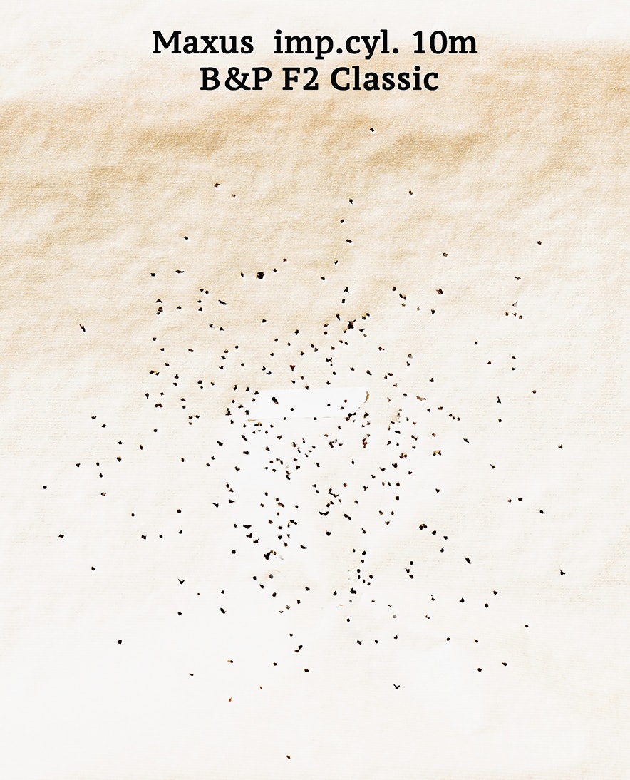 Baschieri & Pellagri F2 Classic gir en fin og jevn sverm, og testens beste i denne hagla på 10 meter! Rizzini syntes også Baschieri & Pellagri F2 Classic var fin på kort hold, selv om skuddbildet ikke ble like bra som i Maxus, med litt klumping og randhagl.