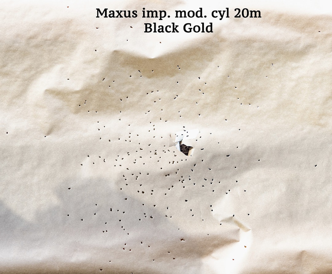 Men når vi labber ut på 20 meter med trangere choke, er ikke Browning og Gamebore Black Gold Dark Storm fullt så gode venner: I utkanten av svermen dukker det opp noen hull og en del hagl begynner å bli egenrådige. Likevel er skuddbildet fra Gamebore Black Gold Dark Storm godt innenfor til jaktbruk.