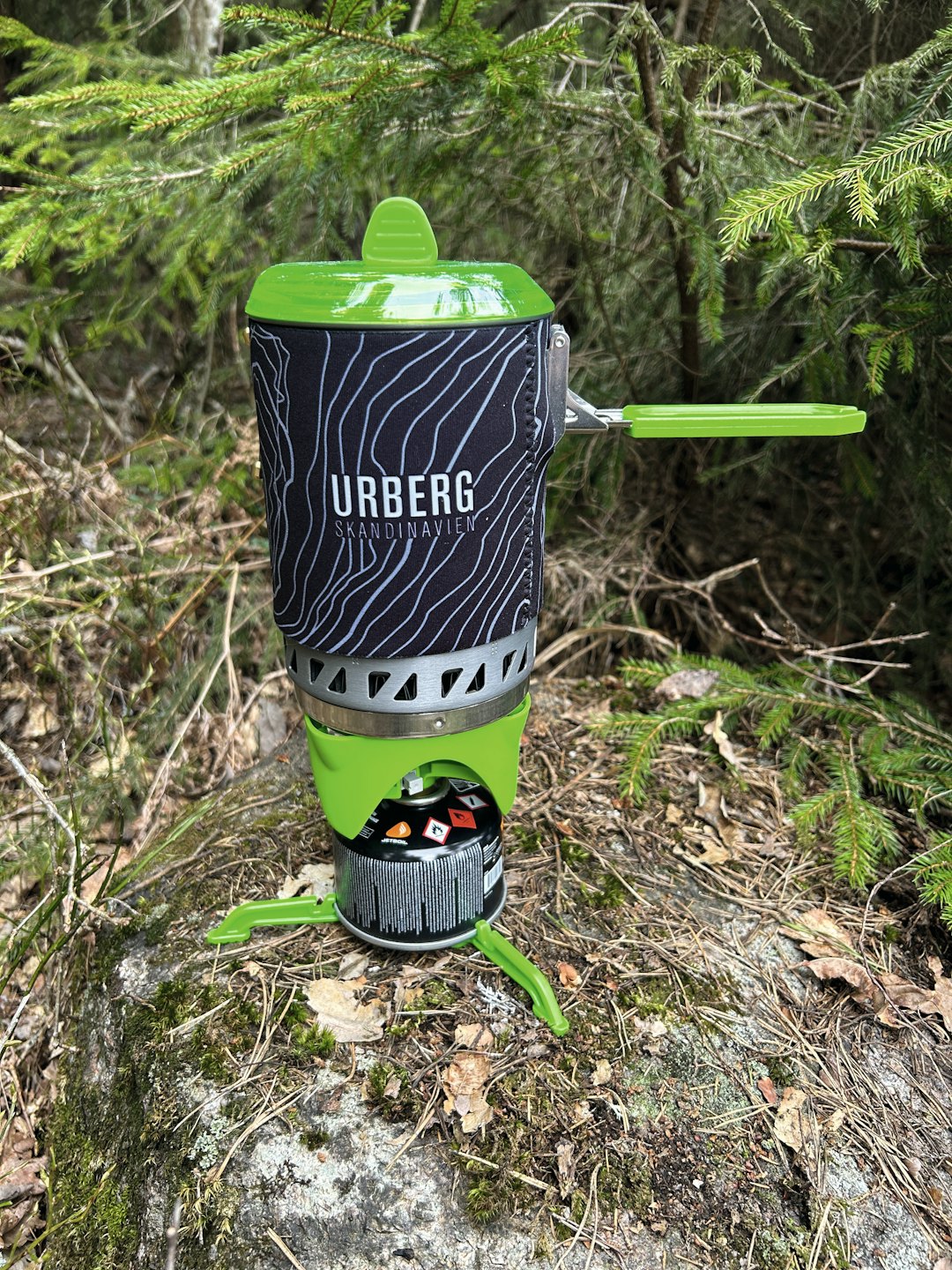 Urberg Rogen Stove leveres med støttebein til gassboks, men her får du ikke med adapter til å bruke annen kjele/stekepanne, noe som trekker litt ned. Det er små ulikheter i designet, men her har man for eksempel det samme håndtaket, som kan felles inn over lokket og låse av. Kjelen låses til brenneren og kan koke 1 liter om gangen. Lokket har ingen helleåpning, kun et lite hull for å slippe ut damp. Det vil si at du må helle vann uten lokket på med denne.