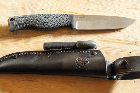 Bladet er noe langt og smalt, noe som gjør at det ikke egner seg spesielt godt til flåing. Men til allroundbruk er dette et bra blad, og den bør også fint kunne brukes til å gjøre opp fisk. Bladet er laget i stållegeringen 7CR17, som er et rustfritt kinesisk stål tilsvarende 440A. Stålkvaliteten er derfor ikke den aller beste, men til normalt bruk bør den holde godt. Men du bør ikke bruke kniven til arbeid som gir sideveis belastning. Til det er bladet for langt og tynt, og det er fare for at bladet brekker eller bøyes. Jaktkniven skjærer papirarket lett rett fra esken. Men den blir ganske fort sløv når vi skjærer i tre, og må skjerpes. Den er derimot lett å få skarp. Skaftet er laget av en hard gummilegering, og gir godt grep. Et litt bedre fingervern hadde vært ønskelig. Skal du primært bruke kniven til jakt bør du heller vurdere en av de to andre knivene fra Robust.