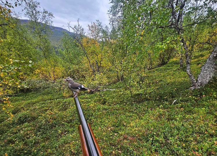 – Den satt et par minutter. Jeg var på jakt etter tiur inne i Dividalen da den plutselig kom flyvende og satte seg. Da var det bare å ta fram mobilen meget forsiktig og få knipset noen bilder. Jeg tenkte at ingen kom til å tro meg om jeg ikke hadde noe bevis av øyeblikket, forteller Bjørn Roald Kristiansen.